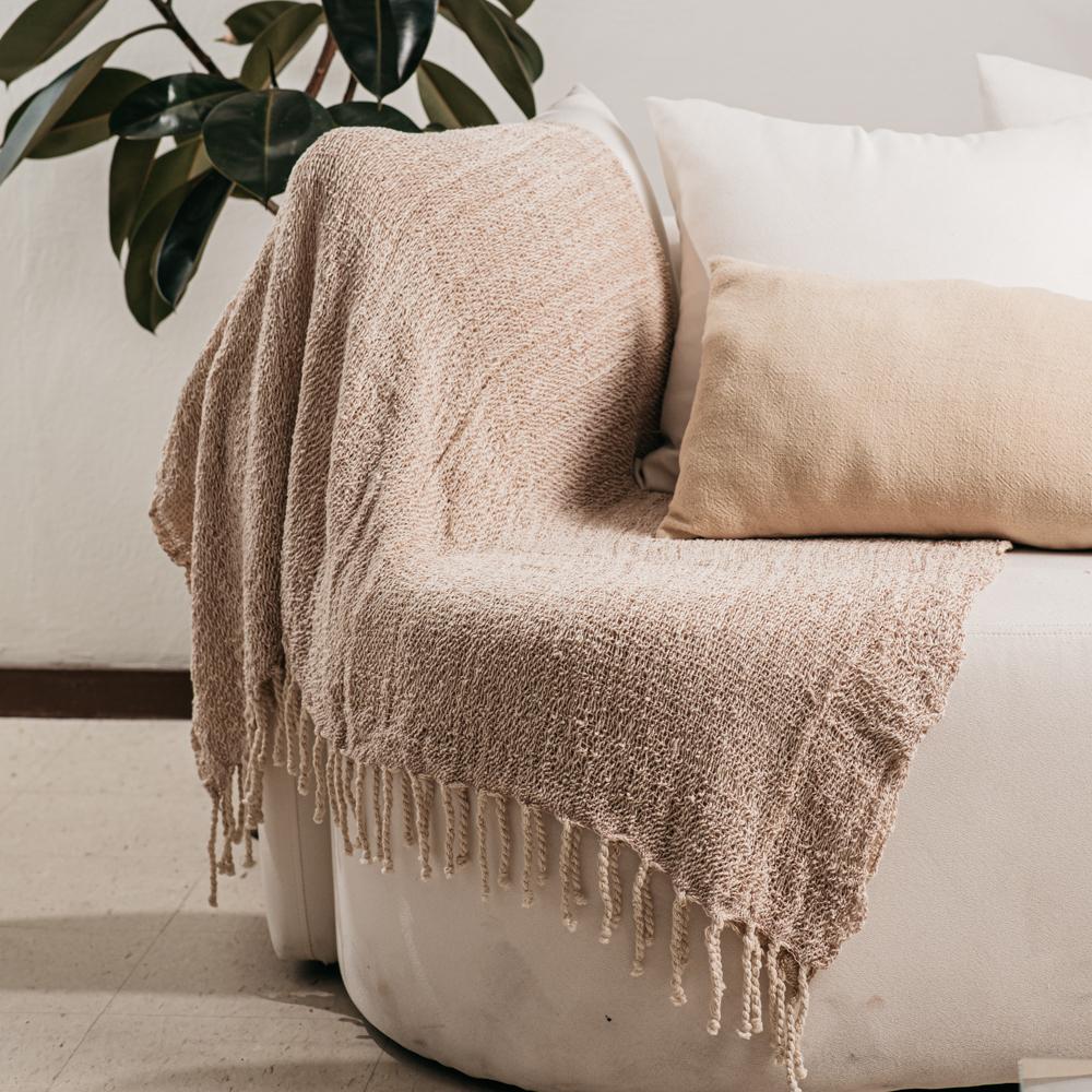 A linha inclui capas de almofada e mantas decorativas em diferentes tamanhos, todas produzidas com tingimento natural da casca de baru, casca de aroeira, folhas de eucalipto e tingui. O processo envolve mais de 60 mulheres, em uma cadeia colaborativa que vai da fiação à tecelagem final.