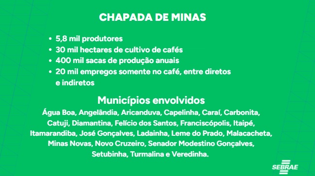 O registro da Região da Chapada de Minas havia sido protocolado no INPI em setembro do ano passado. O Sebrae Minas trabalha em parceria com o Instituto do Café da Chapada de Minas (ICCM) desde a sua criação, em 2018. A parceria teve como foco o desenvolvimento técnico e gerencial dos produtores, por meio de treinamentos, capacitações, visitas técnicas a feiras e eventos do setor, além de Dias de Campo — imersões em propriedades de referência que servem como modelo de boas práticas.